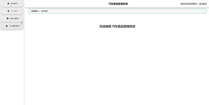 服务部进入系统可以对系统首页,个人中心,服务站管理,三包理赔管理等功能进行操作。服务部主页面如图5-13所示: