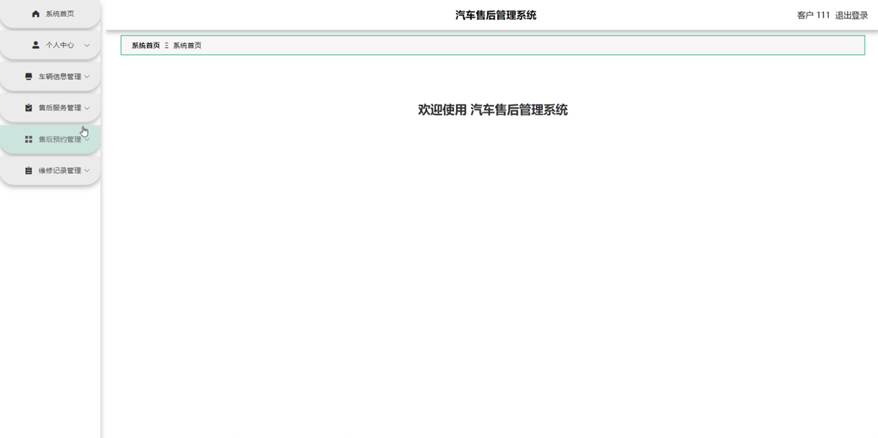 客户进入系统可以对系统首页,个人中心,车辆信息管理,售后服务管理,售后预约管理,维修记录管理等功能进行操作。客户主页面如图5-8所示: