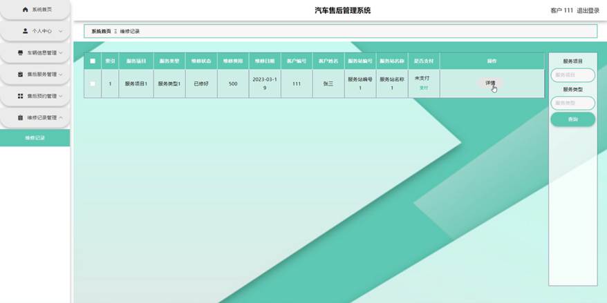 客户点击维修记录管理。在维修记录页面输入服务项目和服务类型进行查询维修记录列表,并根据需要对维修记录详情信息进行详情操作;如图5-9所示: