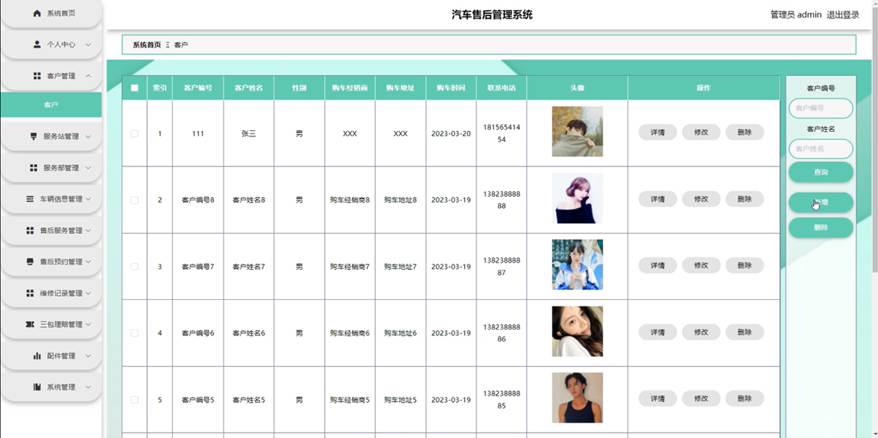 管理员点击客户管理。在客户页面输入客户编号和客户姓名进行查询、新增或删除客户列表,并根据需要对客户详情信息进行详情、修改或删除操作;如图5-3所示: