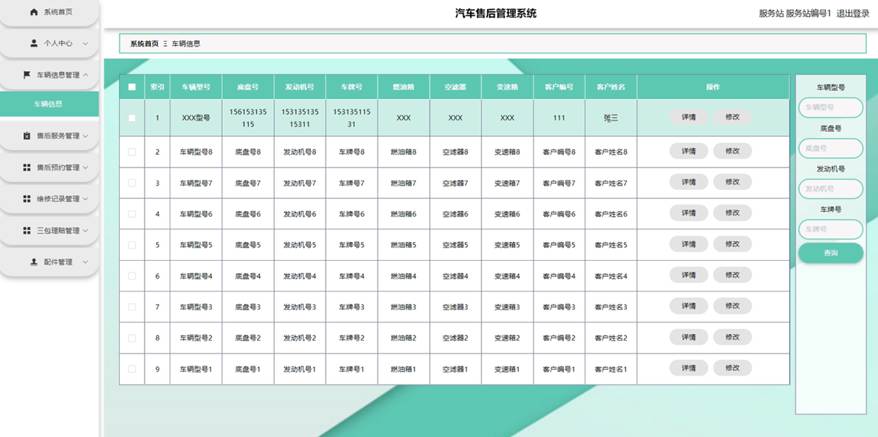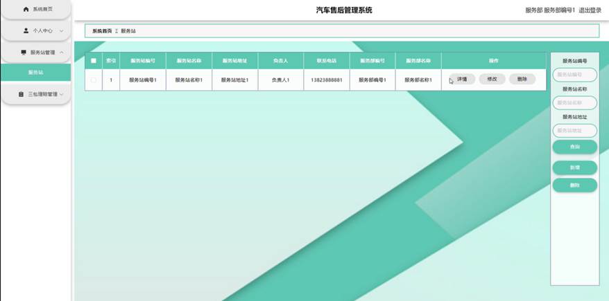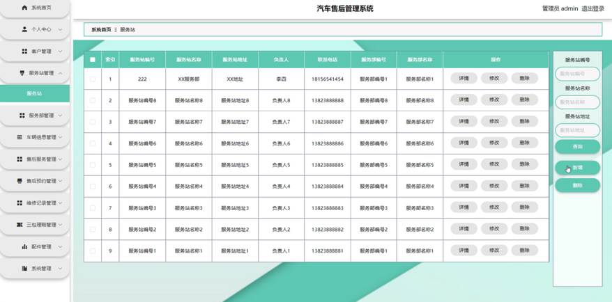 服务部点击服务站管理。在服务站页面输入服务站编号、服务站名称和服务站地址进行查询、新增或删除服务站列表,并根据需要对服务站详情信息进行详情、修改或删除操作;如图5-14所示: