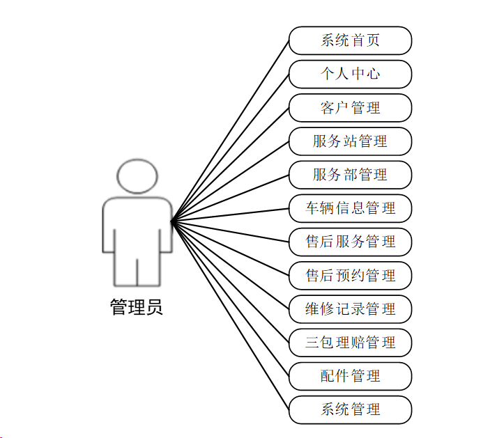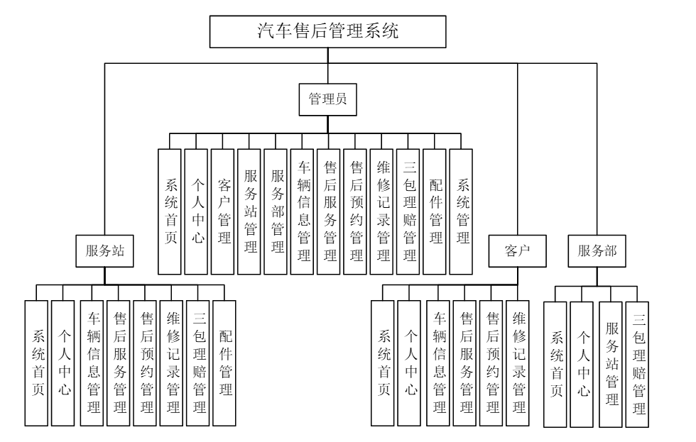 汽车售后管理系统的使用者主要有四类用户,一类是管理员,他拥有整个系统的最高权限,然后是服务站,服务部和客户,都只能对自己的个人信息进行操作。系统根据这四类用户,划分出了四大功能模块。