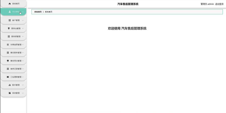 管理员进入主页面,主要功能包括对系统首页,个人中心,客户管理,服务站管理,服务部管理,车辆信息管理,售后服务管理,售后预约管理,维修记录管理,三包理赔管理,配件管理,系统管理等进行操作。管理员主页面如图5-2所示: