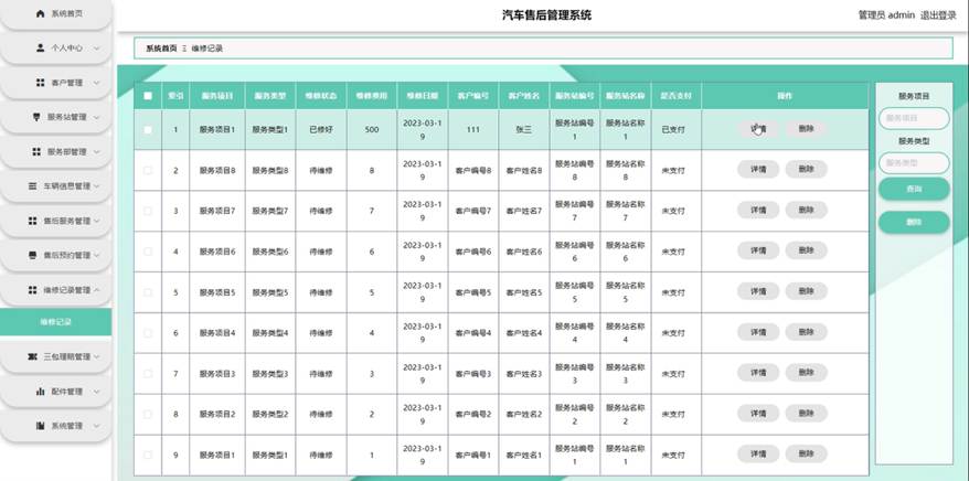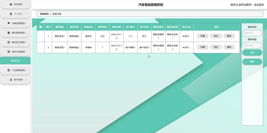 服务站点击维修记录管理。在维修记录页面输入服务项目和服务类型进行查询或删除维修记录列表,并根据需要对维修记录详情信息进行详情、修改或删除操作;如图5-12所示: