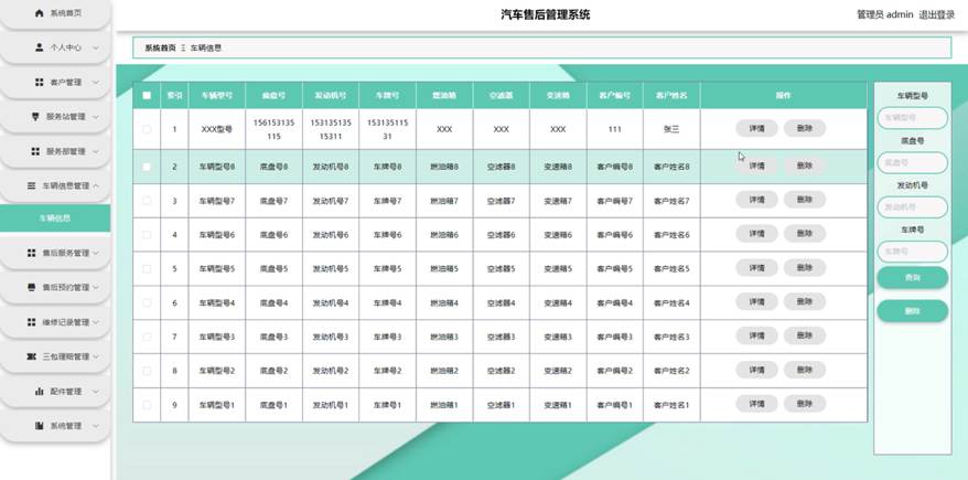 服务站点击车辆信息管理。在车辆信息页面输入车辆型号,底盘号,发动机号和车牌号进行查询车辆信息列表,并根据需要对车辆详情信息进行详情或删除操作;如图5-11所示: