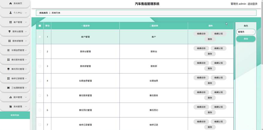 管理员点击系统管理。在菜单列表页面输入角色进行查询菜单列表,并根据需要对菜单列表详情信息进行编辑名称、编辑父级或删除操作;如图5-7所示: