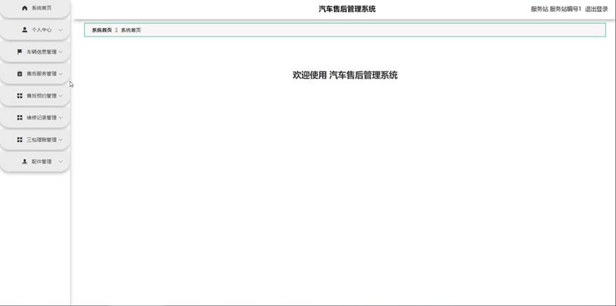 服务站进入系统可以对系统首页,个人中心,车辆信息管理,售后服务管理,售后预约管理,维修记录管理,三包理赔管理,配件管理等功能进行操作。服务站主页面如图5-10所示: