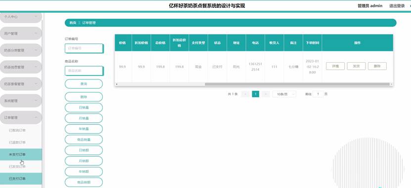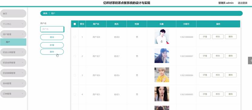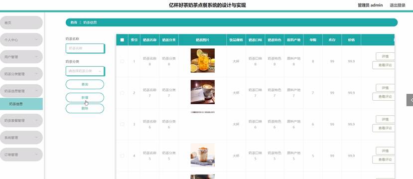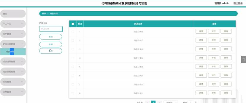 管理员端的功能主要是开放给系统的管理人员使用,能够对用户的信息进行管理,包括对用户管理、奶茶分类管理、奶茶信息管理、奶茶套餐管理、系统管理、订单管理进行查看,修改和删除、新增等,对系统整体运行情况进行了解。