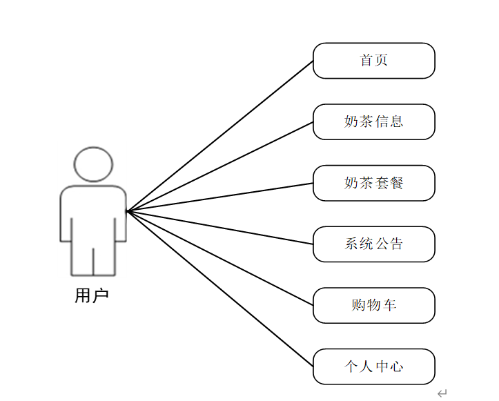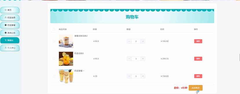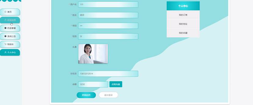 用户的功能主要是对个人账号和密码进行更新管理,然后对首页、奶茶信息、奶茶套餐、系统公告、购物车、个人中心进行查询详情操作。