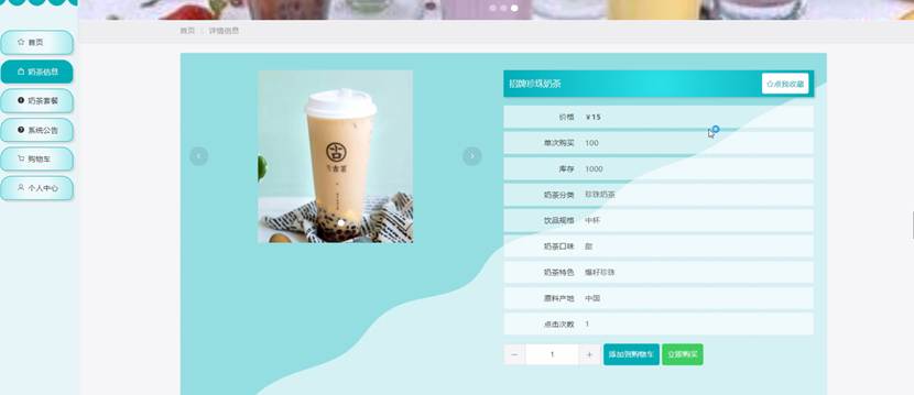 用户点击奶茶信息;在奶茶信息页面的搜索栏输入奶茶名称、奶茶分类进行查询,然后还可以查看奶茶名称、奶茶分类、奶茶图片、饮品规格、奶茶口味、奶茶特色、原料产地、单限、库存、价格、点击次数等信息,如有需要可以添加到购物车、立即购买或者收藏评论等操作;如图5-4所示。