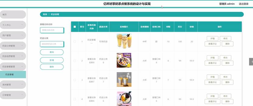 管理员点击奶茶套餐管理,在奶茶套餐管理页面,对套餐名称、奶茶分类、套餐图片、套餐规格、套餐口味、单限、库存、价格等内容,进行查询或者新增、删除奶茶套餐等操作,如图5-13所示。