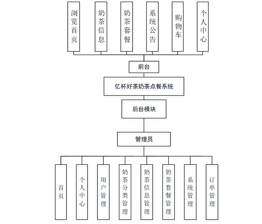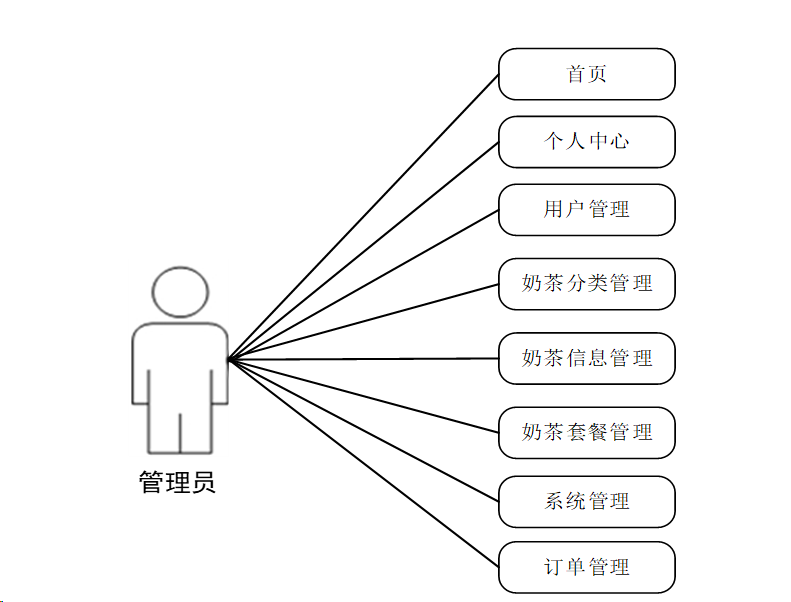 管理员主要功能是:用户管理、奶茶分类管理、奶茶信息管理、奶茶套餐管理、系统管理、订单管理等功能。系统功能模块图如图4-1所示。