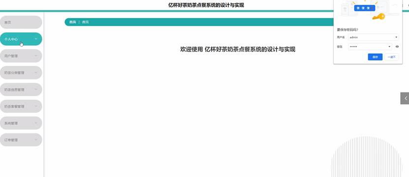 管理员登录到系统后台后,可以对首页、个人中心、用户管理、奶茶分类管理、奶茶信息管理、奶茶套餐管理、系统管理、订单管理等功能模块进行管理;如图5-9所示。