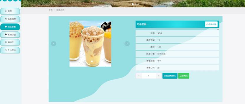 用户点击奶茶套餐;在奶茶套餐页面的搜索栏输入奶茶名称、奶茶分类进行查询,然后还可以查看套餐名称、奶茶分类、套餐图片、套餐规格、套餐口味、单限、库存、价格、点击次数等信息,如有需要可以添加到购物车、立即购买或者收藏评论等操作;如图5-5所示。