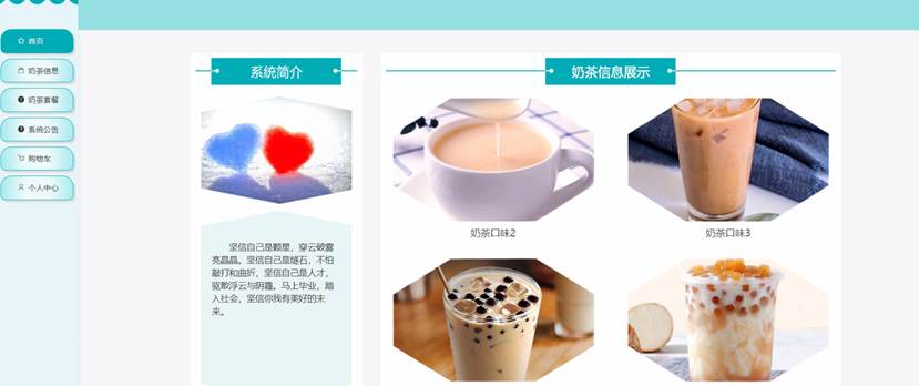 当游客打开系统的网址后,首先看到的就是首页界面。在这里,游客能够看到亿杯好茶奶茶点餐系统的导航条显示首页、奶茶信息、奶茶套餐、系统公告、购物车、个人中心等。系统首页界面如图5-1所示: