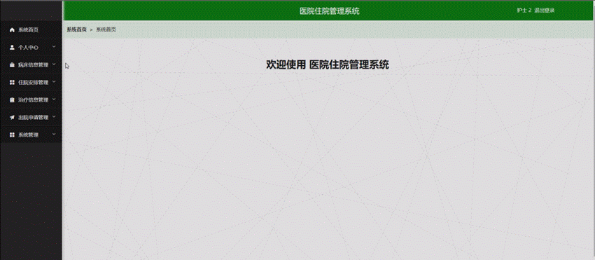 管理员进入主页面,主要功能包括对首页、个人中心、病床信息管理、住院安排管理、治疗信息管理、出院申请管理、系统管理等进行操作。管理员主页面如图所示: