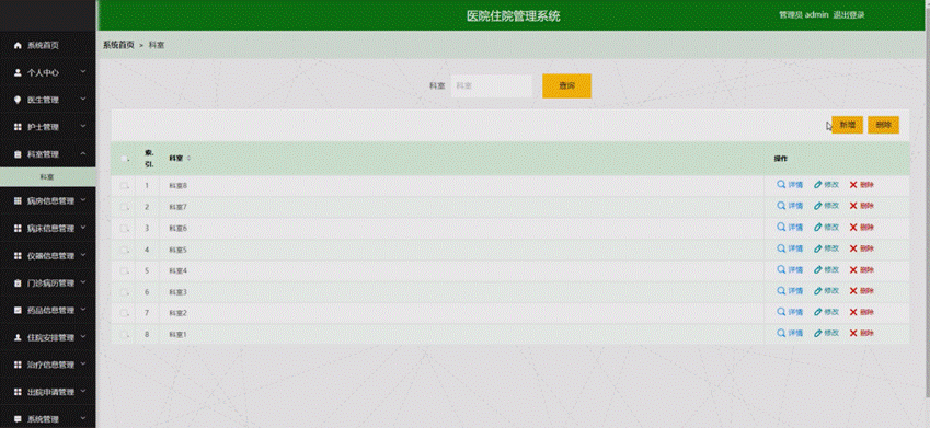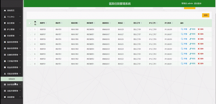 管理员点击住院安排管理。进入住院安排管理页面输入相关信息可以查询,同时进行详情查看、修改、删除等操作。界面如图所示: