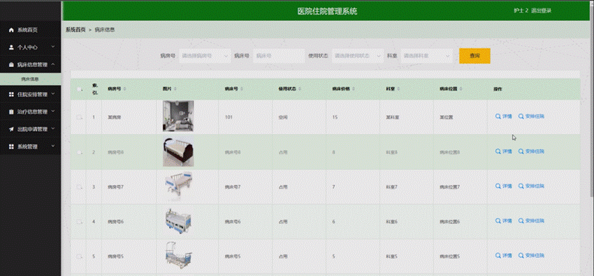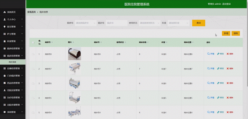 管理员点击病床信息管理理。进入病床信息管理页面输入病房号、病床号、使用状态、科室可以查询,同时对病床信息管理信息进行详情查看、修改、删除等操作。界面如图所示: