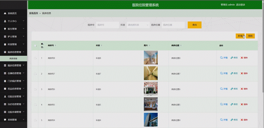 管理员点击病房信息管理。进入病房信息管理页面输入病房号、可是、病房位置可以查询,同时可以对病房信息管理进行新增、在线详情查看、修改、删除等操作。界面如图所示: