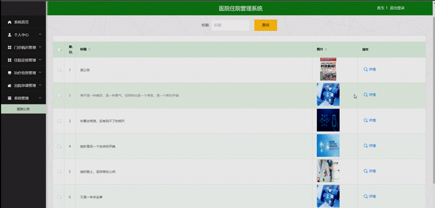 系统管理,进入系统管理界面,医生可以通过输入比他进行查询的,对医院公告信息进行详情查看的操作。界面如图所示: