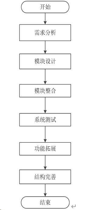 系统的开发流程设计简单的介绍了开发过程,先对任务书进行分析,根据要实现的功能对各个模块进行开发,之后再对模块一一进行测试,测试成功后将模块整合再测试整体功能,完善整体结构[6]。开发系统流程图如图4-3所示。