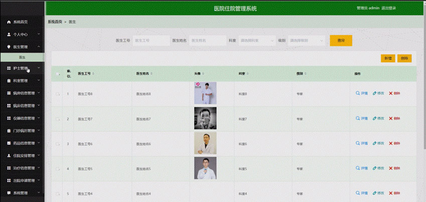 管理员点击医生管理。进入用户管理页面可以输入医生工号、医生姓名、科室进行查询、新增和删除用户详细信息,并进行详情,修改和删除操作;界面如图所示: