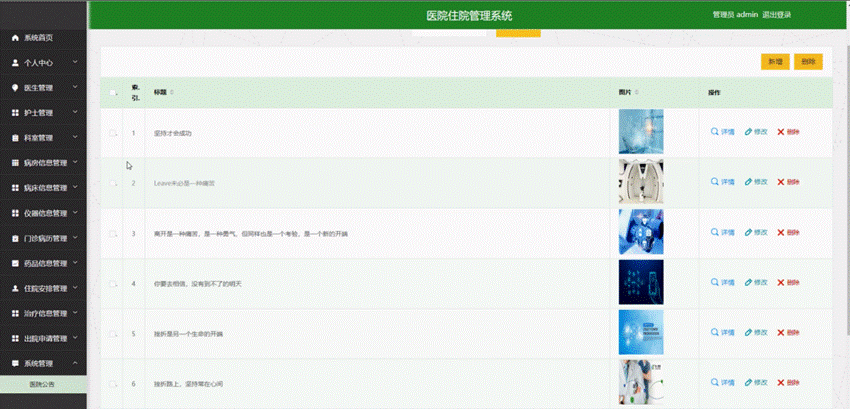 管理员点击系统管理。进入系统管理页面可以对医院公告模块进行管理,输入相信息进行查询,对医院公告进行详情查看、修改、删除等操作。界面如图所示: