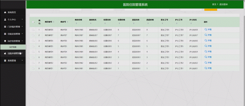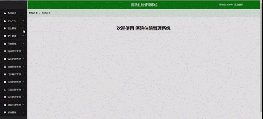 管理员进入主页面,主要功能包括对首页、个人中心、医生管理、护士管理、科室管理、病房信息管理、病床信息管理、仪器信息管理、门诊病历管理、药品信息管理、住院安排管理、治疗信息管理、出院申请管理、系统管理等进行操作。管理员主页面如图所示: