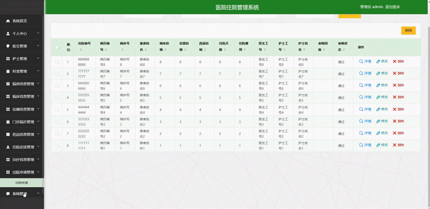 管理员点击出院申请管理。进入出院申请管理页面输入相关信息可以查询,同时进行详情查看、修改、删除等操作。界面如图所示: