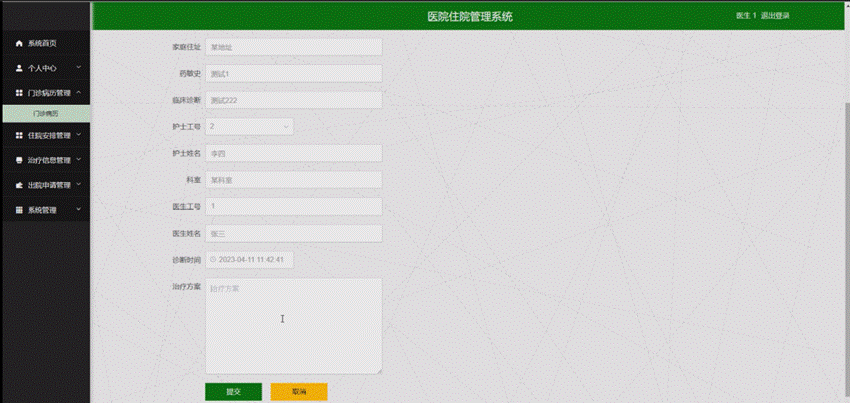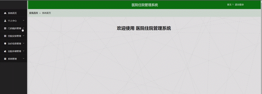 进入主页面,主要功能包括对首页、个人中心、门诊病历管理、住院安排管理、治疗信息管理、出院申请管理、系统管理等进行操作。医生主页面如图所示: