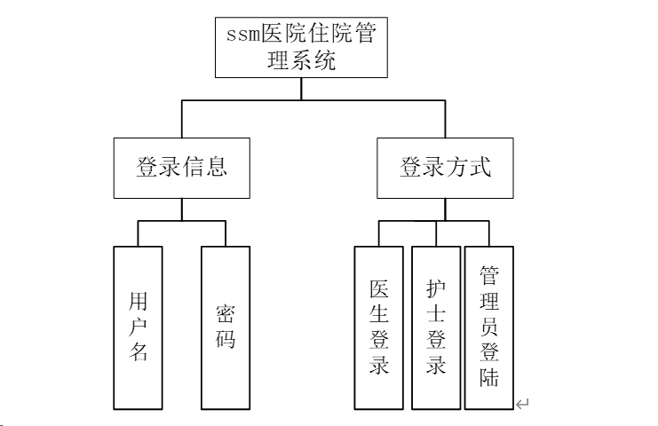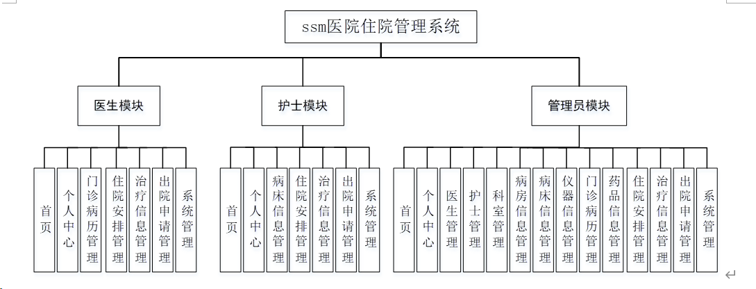 管理员模块属于是网站的后台,进入之后有大量的管理员功能,管理员也可以使用用户模块的功能,为了维护网站的稳定与页面的布局,将管理员模块的功能详细化后可以使用系统管理对页面进行布局修改,包括个人中心、医生管理、护士管理、科室管理、病房信息管理、病床信息管理、仪器信息管理、门诊病历管理、药品信息管理、住院安排管理、治疗信息管理、出院申请管理、系统管理等模块,可以发布公告提示用户规范,用户模块只可以医院住院管理系统等进行查询等,并且更改个人信息,医院住院管理系统总体结构图如图4-2所示。