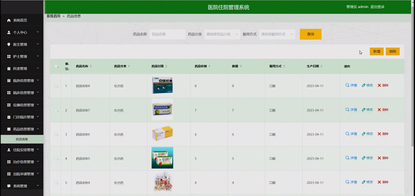 管理员点击药品信息管理。进入药品信息管理页面输入药品名称、药品分类、服用方式可以查询,同时进行详情查看、修改、删除等操作。界面如图所示: