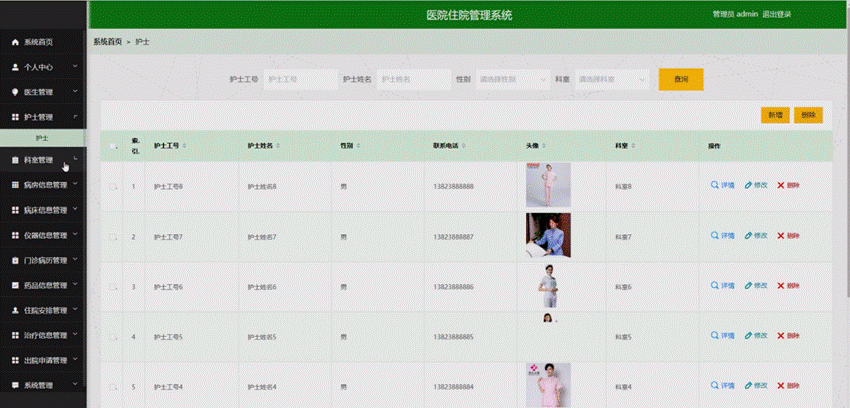管理员点击护士管理。进入护士管理页面输入护士工号、护士姓名、性别。科室可以查询,进行新增、删除的操作。管理界面如图所示: