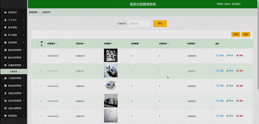 管理员点击仪器信息管理。进入仪器信息管理页面输入仪器名称可以查询和进行删除。同时对仪器信息管理信息进行详情查看、修改、删除等操作。界面如图所示: