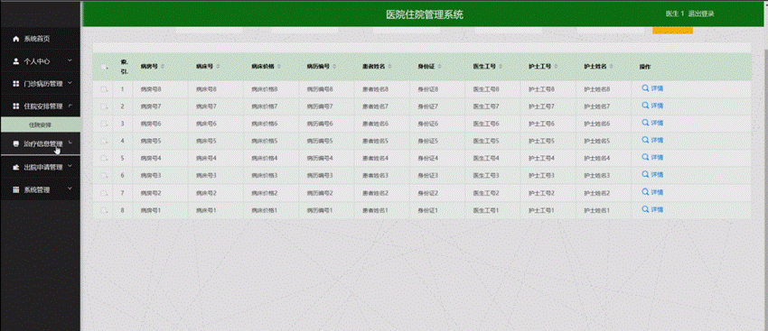 系统核心功能涵盖个人中心、医生管理、护士管理、科室管理、病房信息管理、病床信息管理、仪器信息管理、门诊病历管理、药品信息管理、住院安排管理、治疗信息管理、出院申请管理、系统管理等。可实现多角色(管理员、医生、护士)权限管控、患者门诊病历数字化录入、病房与病床状态实时管理、住院安排与治疗信息跟踪、药品与仪器库存管理、出院申请审核与费用核算。这些功能覆盖从患者入院到出院的全流程,通过数字化手段解决传统住院管理中信息分散、流程低效的痛点,提升住院管理效率与医疗服务质量。