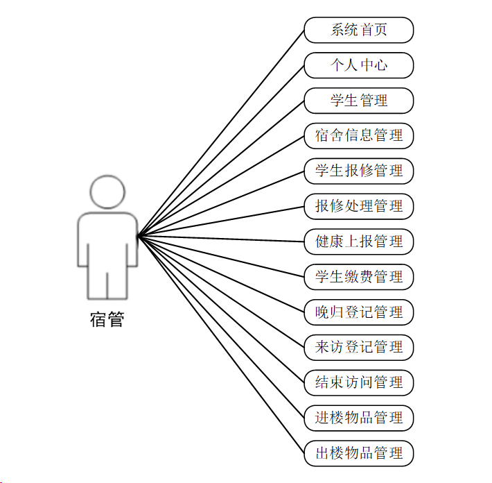 宿管用例图根据宿管的需求进行分析,包括系统首页,个人中心,学生管理,宿舍信息管理,学生报修管理,报修处理管理,健康上报管理,学生缴费管理,晚归登记管理,来访登记管理,结束访问管理,进楼物品管理,出楼物品管理等。宿管用例图如下所示:
