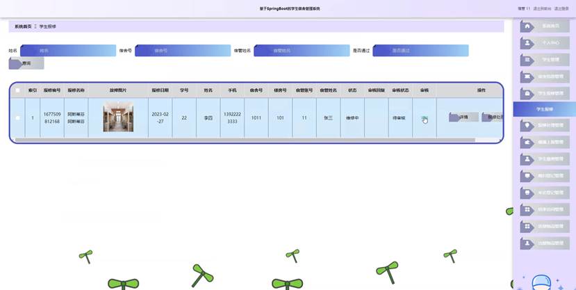 宿管点击学生报修管理。进入学生报修页面输入姓名,宿舍号,宿管姓名和是否通过可以查询学生报修信息,并进行查看详情,申报,报修处理或删除操作。如图5-17所示:
