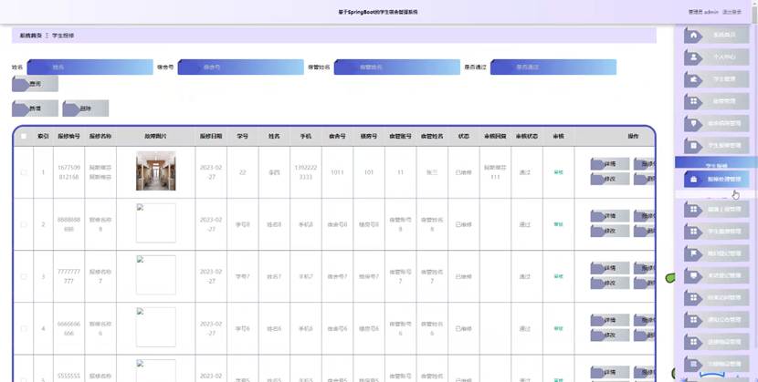 管理员点击学生报修管理。进入学生报修页面输入姓名,宿舍号,宿管姓名和是否通过可以查询,新增或删除学生报修信息,并进行查看详情,修改,报修处理或删除操作。如图5-10所示: