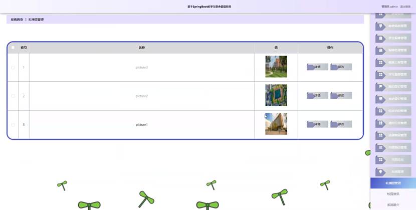 管理员点击系统管理,进入系统管理页面可以对轮播图管理进行详情或修改操作,还可以对校园资讯,系统简介等进行详细操作。如图5-14所示:
