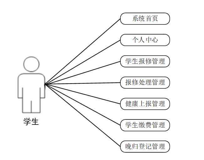 学生用例图根据学生的需求进行分析,包括系统首页,个人中心,学生报修管理,报修处理管理,健康上报管理,学生缴费管理,晚归登记管理等。学生用例图如下所示: