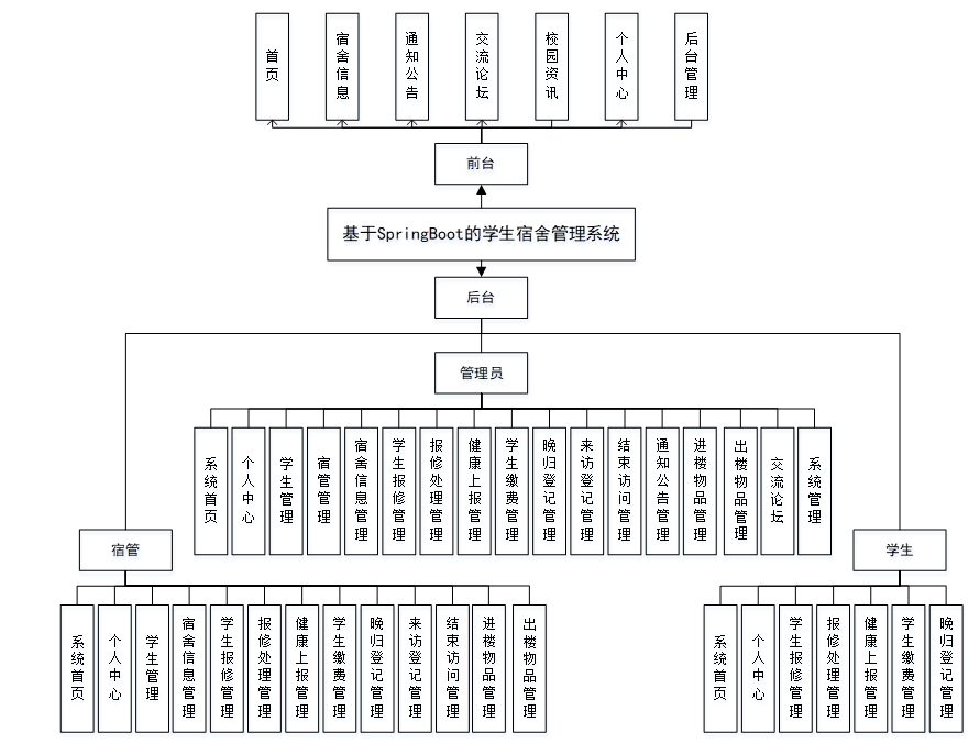(1)功能要求:管理人员可以管理自己的个人中心,对学生管理,宿管管理,宿舍信息管理,学生报修管理,报修处理管理,健康上报管理,学生缴费管理,晚归登记管理,来访登记管理,结束访问管理,通知公告管理,进楼物品管理,出楼物品管理,交流论坛,系统管理等功能模块进行管理 [3]。