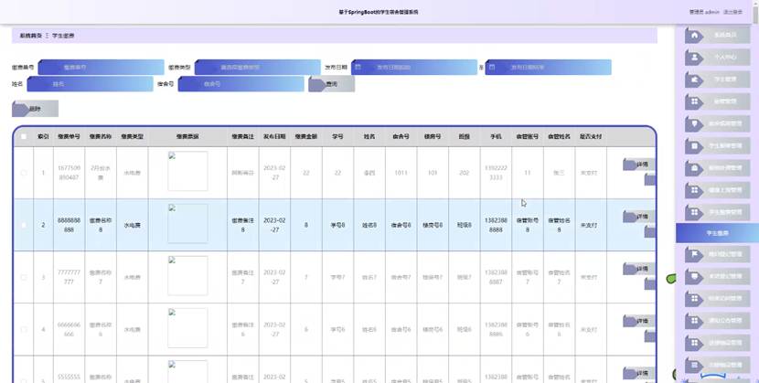 管理员点击学生缴费管理。进入学生缴费页面输入缴费单号,缴费类型,发布日期,姓名和宿舍号可以查询或删除学生缴费详细信息,并进行详情,修改,或删除操作。如图5-12所示: