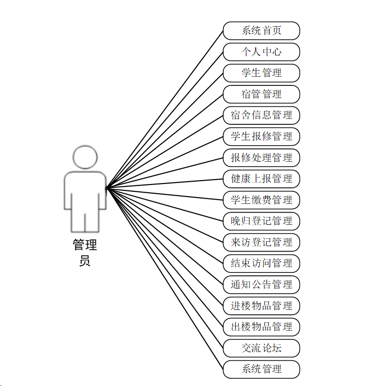 本管理系统的用例图根据角色权限进行分类,主要可分为管理员用例,宿管用例和学生用例。