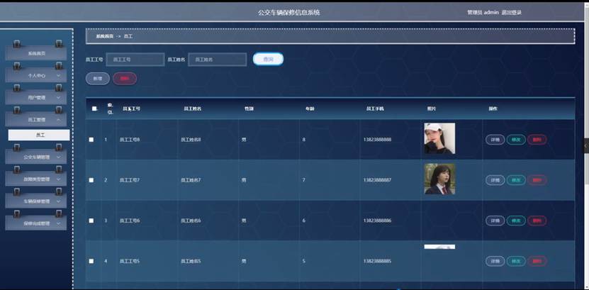 管理员点击员工管理。在员工页面输入员工工号和员工姓名进行查询、新增或删除员工列表,并根据需要对员工详情信息进行详情、修改或删除操作;如图5-4所示: