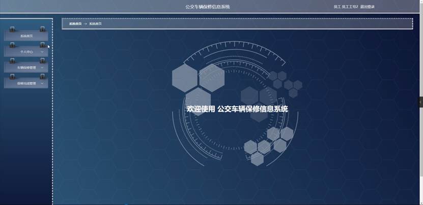 用户进入主页面,主要功能包括对系统首页、个人中心、公交车辆管理、车辆保修管理、保修完成管理等进行操作。用户主页面如图5-9所示:
