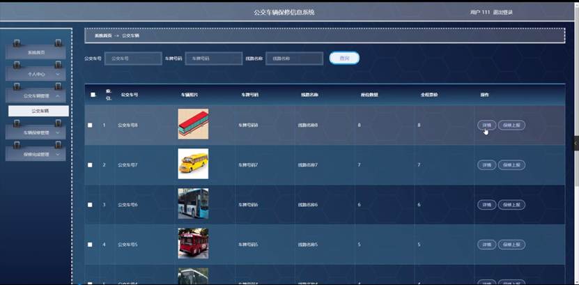 用户点击公交车辆管理。在公交车辆页面输入公交车号、车牌号码、线路名称进行查询公交车辆列表,并根据需要对公交车辆详情信息进行详情或保修上报操作;如图5-10所示: