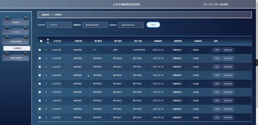 员工点击车辆保修管理。在车辆保修页面输入公交车号、选择故障类型和选择完成状态进行查询车辆保修列表,并根据需要对车辆保修详情信息进行详情或保修完成操作;如图5-13所示: