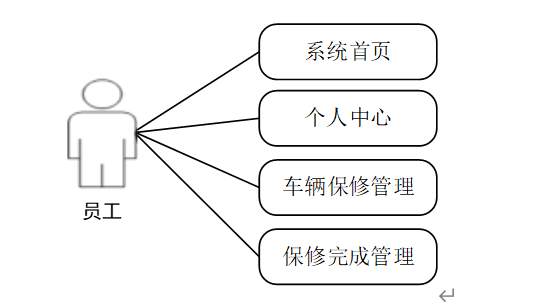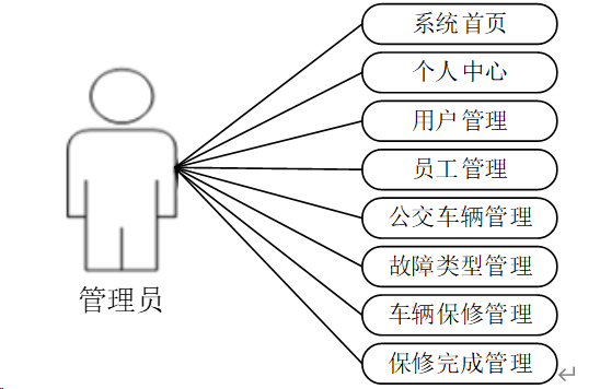 本文提出了一种基于面向对象的思想方法,以适应系统的实际功能与性能要求。为了使公交车辆保修信息管理更具自动化和亲和力,在对公交车辆保修进行简单的需求分析之后,将其分为三大功能模块,分别为管理员、用户和员工。其用例如下: