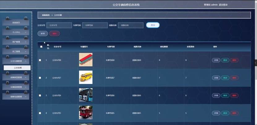 管理员点击公交车辆管理。在公交车辆页面输入公交车次、车牌号码和线路名称进行查询、新增或删除公交车辆列表,并根据需要对公交车辆详情信息进行详情、修改或删除操作;如图5-5所示: