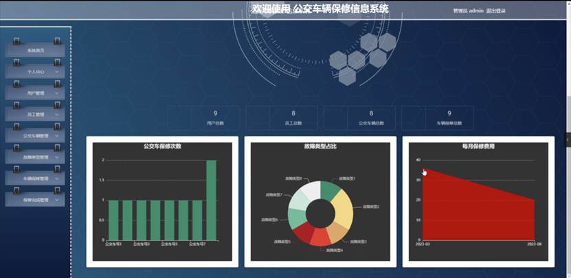 管理员进入主页面,主要功能包括对系统首页、个人中心、用户管理、员工管理、公交车辆管理、故障类型管理、车辆保修管理、保修完成管理等进行操作。管理员主页面如图5-2所示: